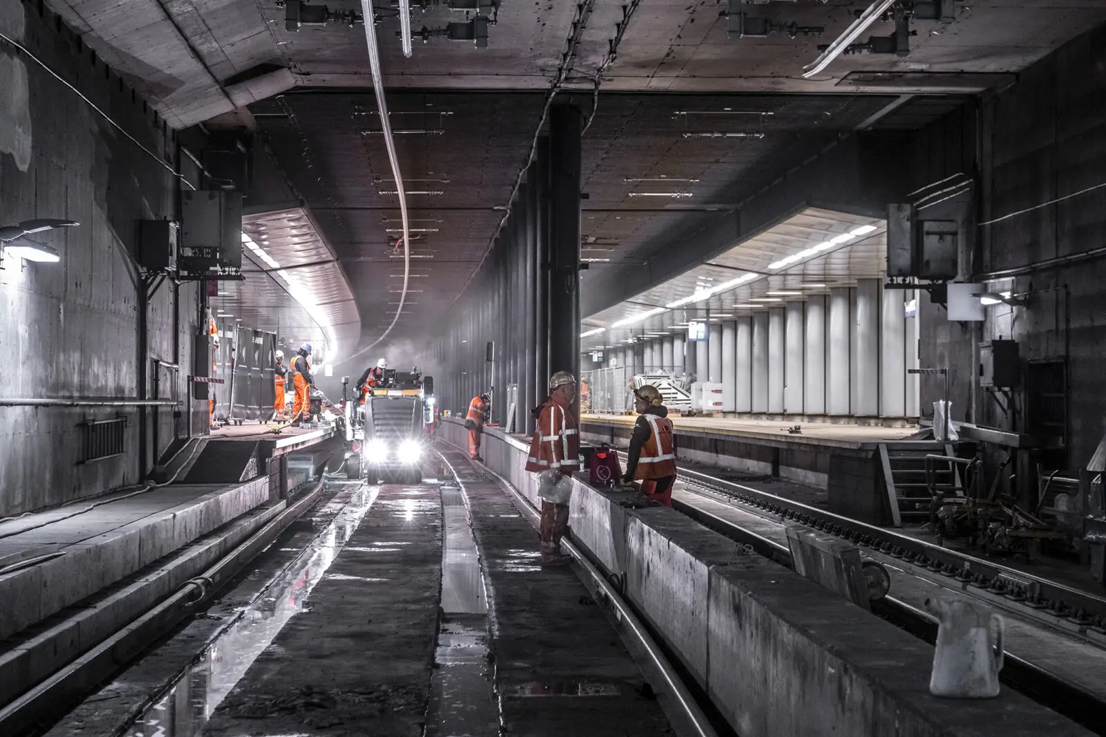 Renewing rail infrastructure in a tunnel beneath one of Europe’s busiest airports is a logistical and technical challenge. To complete the works safely and efficiently, 39 train-free periods have been scheduled until 2028. During these windows, teams work intensively to replace tracks, sleepers and switches, install a new conductor rail system, and upgrade train protection systems. Platforms are being raised to improve accessibility, using an innovative beam track design that offers a longer lifespan and reduced maintenance.
